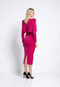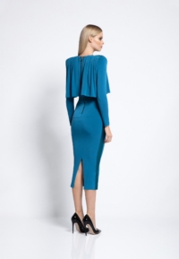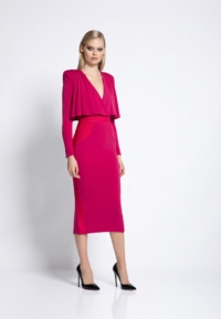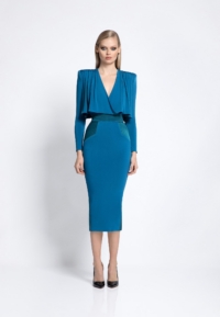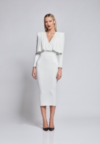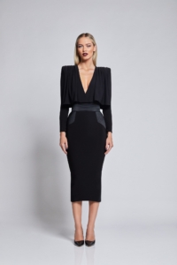 FULLY LINED JERSEY MIDI DRESS WITH DRAPED OVERLAY BODICE FEATURE, STITCHED SATIN PANELLING AND SHOULDER ACCENTS.