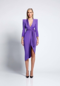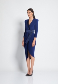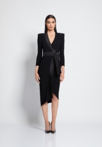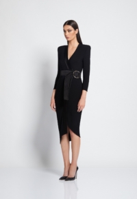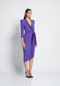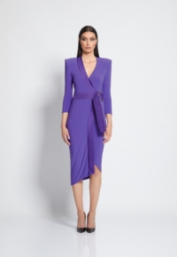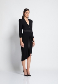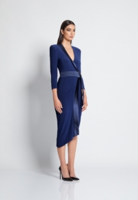 FULLY LINED JERSEY WRAP DRESS WITH SATIN WAIST TIES & RING CLOSURE DETAIL FOR EASIER FIT.