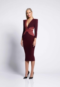 FULLY LINED JERSEY MIDI DRESS WITH V-NECK, BODICE CUT OUTS & SHOULDER ACCENTS. METALLIC STITCHED SATIN PANELLING.