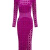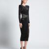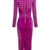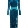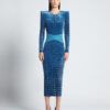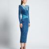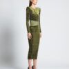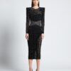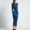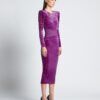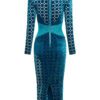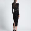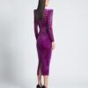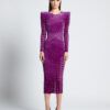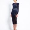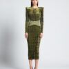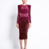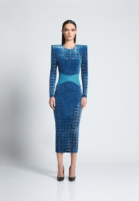 LASER CUT GILDED VELVET MIDI DRESS WITH STITCHED SATIN PANELLING, SHEER BACK BODICE & SLEEVES & SHOULDER ACCENTS.