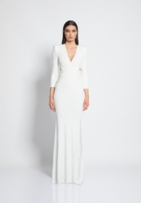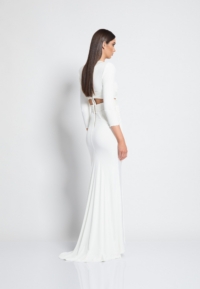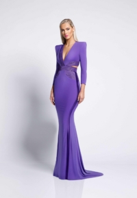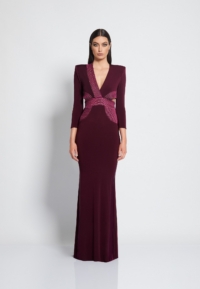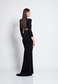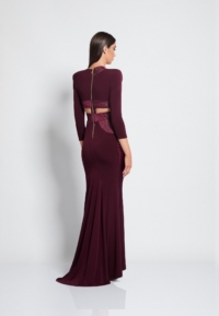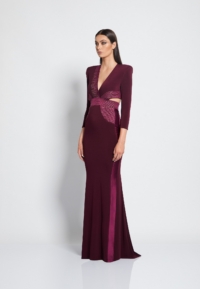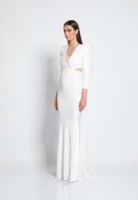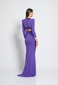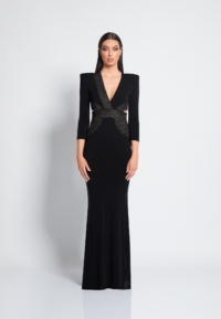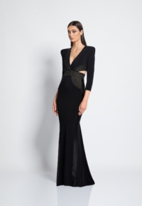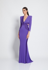 FULLY LINED JERSEY GOWN WITH V-NECK, BODICE CUT OUTS & SHOULDER ACCENTS. METALLIC STITCHED SATIN PANELLING.
