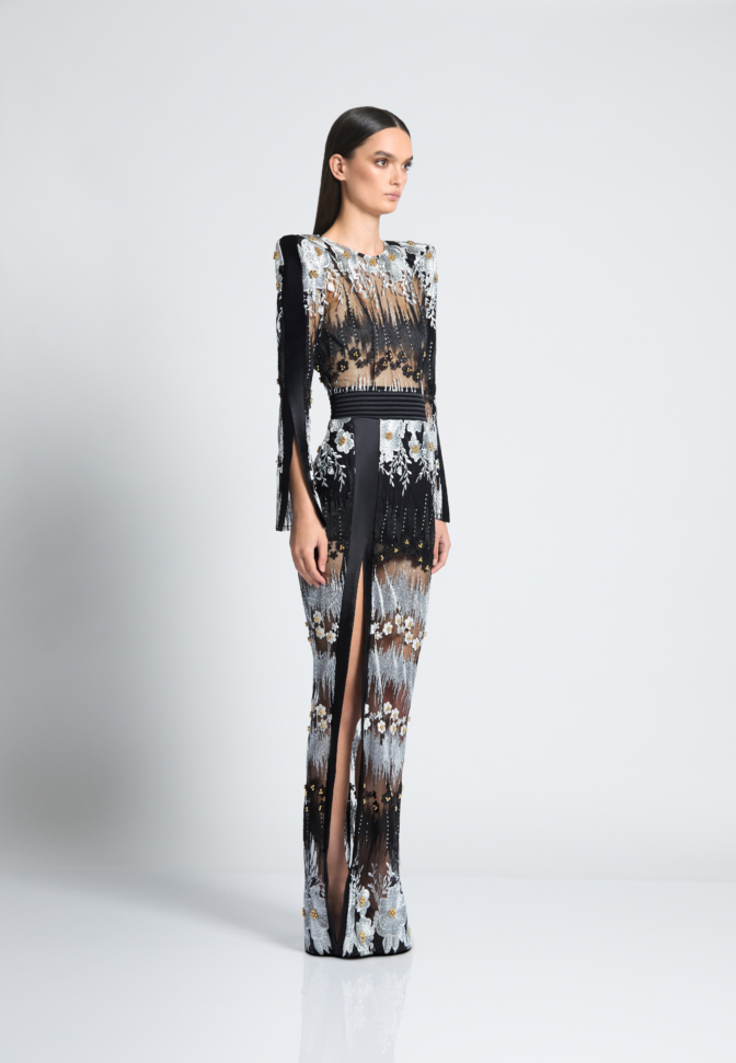 SHEER LACE DRESS WITH BEAD DETAIL, STITCHED SATIN PANELLING & SHOULDER ACCENTS.