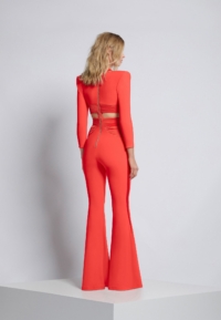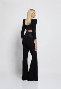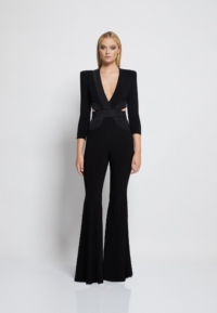 A FULLY LINED JERSEY JUMPSUIT WITH STITCHED SATIN PANELLING, SIDE CUT OUTS AND FLARED LEGS.