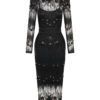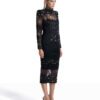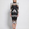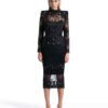 AN EMBELLISHED MESH MIDI DRESS WITH STITCHED SATIN PANELLING AND SHOULDER ACCENTS. COMES WITH OPTIONAL SLIPWITH ADJUSTABLE STRAPS.