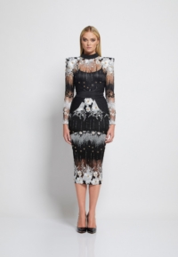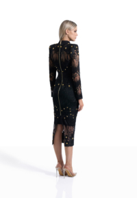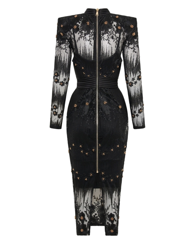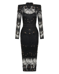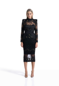 AN EMBELLISHED MESH MIDI DRESS WITH STITCHED SATIN PANELLING AND SHOULDER ACCENTS. COMES WITH OPTIONAL SLIPWITH ADJUSTABLE STRAPS.