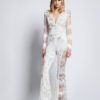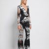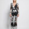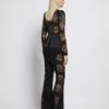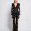 AN EMBELLISHED MESH JUMPSUIT WITH V NECK FRONT, STITCHED SATIN PANELLING, FLARED LEGS AND SHOULDER ACCENTS. SHEER SLEEVES AND BACK BODICE.