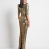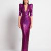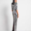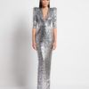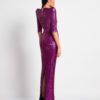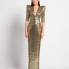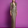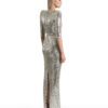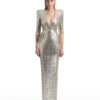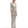 A STRETCH SEQUIN GOWN WITH PLUNGE FRONT, SKIRT TUCKS AND ACCENTUATED SHOULDERS. FLEXIBLE FIT FOR ALL BODY SHAPES.