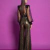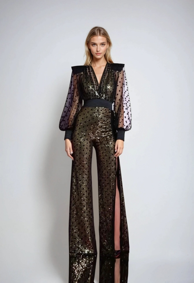 A DOTTED MESH AND SEQUIN JUMPSUIT WITH GATHERED BODICE AND LEG DETAIL.