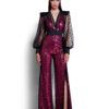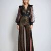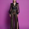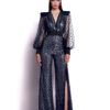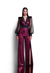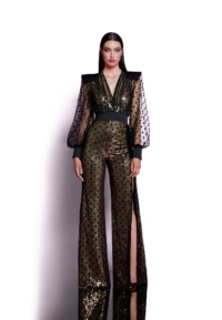 A DOTTED MESH AND SEQUIN JUMPSUIT WITH GATHERED BODICE AND LEG DETAIL. STITCHED SATIN PANELLING AND SHOULDER ACCENTS.
