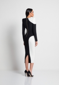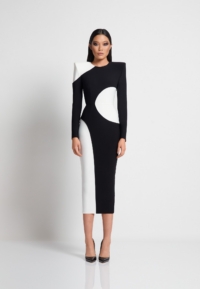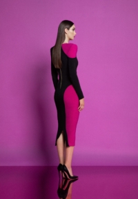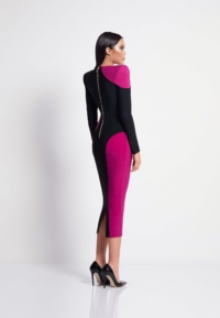 THIS DRESS IS MADE FROM STRETCH JERSEY IT IS VERY ACCOMMODATING TO ALL BODY TYPES AND HUGS THE BODY, GIVEN THE FLEXIBLE NATURE OF THE FABRIC. THE CONTRAST PANELS CREATE A VISUAL DELIGHT WITH ACCENTUATED SHOULDERS. THE FIT IS TRUE TO SIZE.