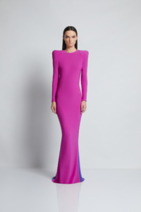 A FULLY LINED BACKLESS CONTRAST JERSEY GOWN WITH ACCENTUATED SHOULDERS AND CENTRE BACK ZIP CLOSURE.