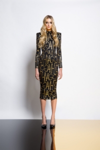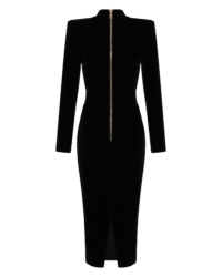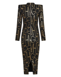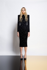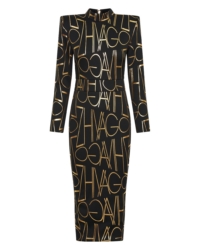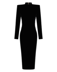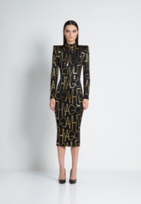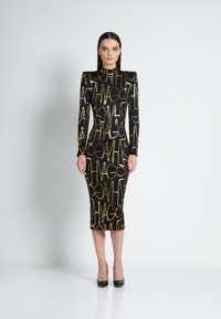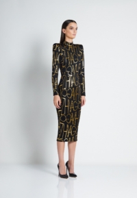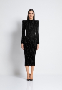 A LONG SLEEVE PRINTED MIDI DRESS WITH SHOULDER ACCENTS. AVAILABLE IN EMBOSSED VELVET OR FOIL PRINT.