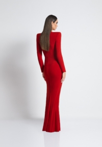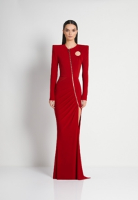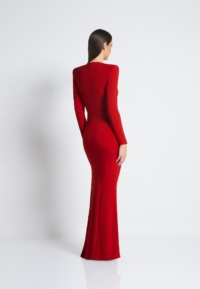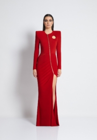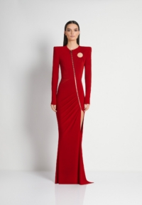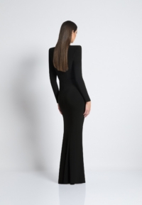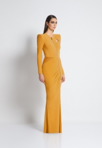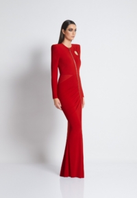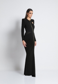 A FULLY LINED EASY FIT JERSEY GOWN WITH PLEATED RING CUT OUT DETAIL, FRONT ZIP, SATIN PANEL & SHOULDER ACCENTS.