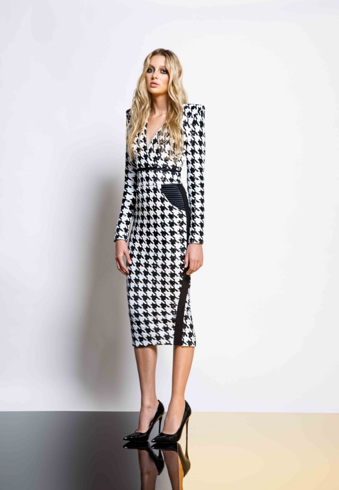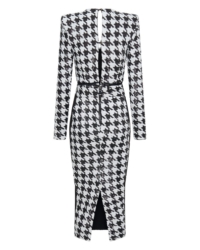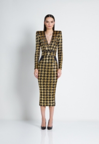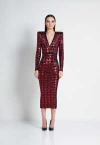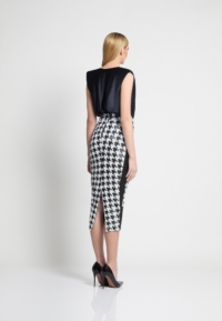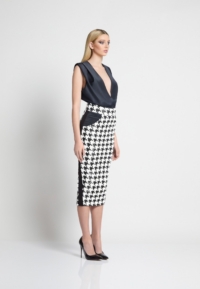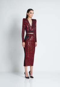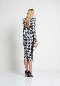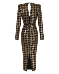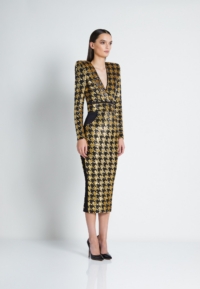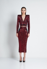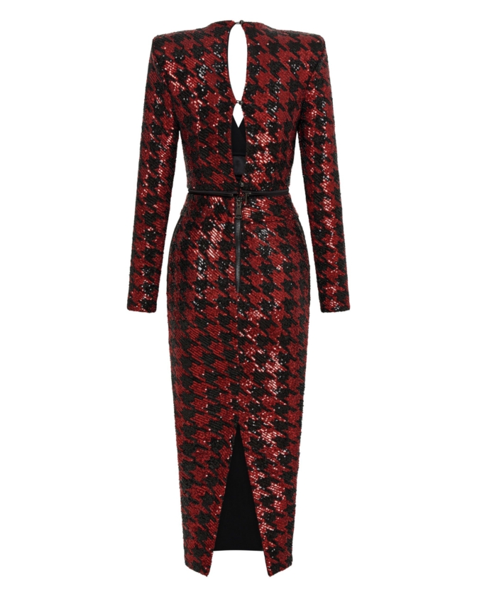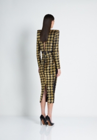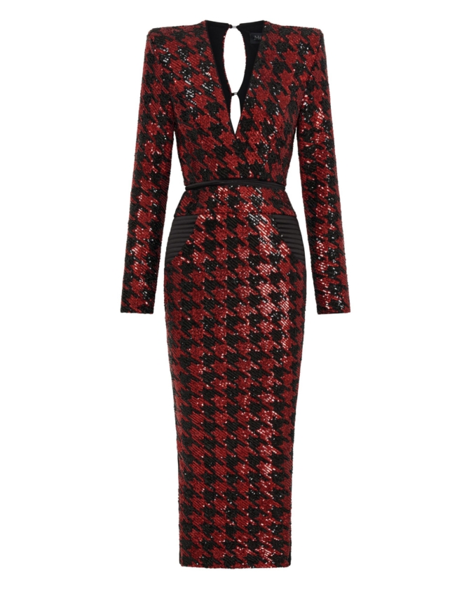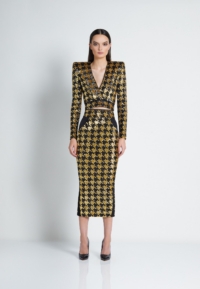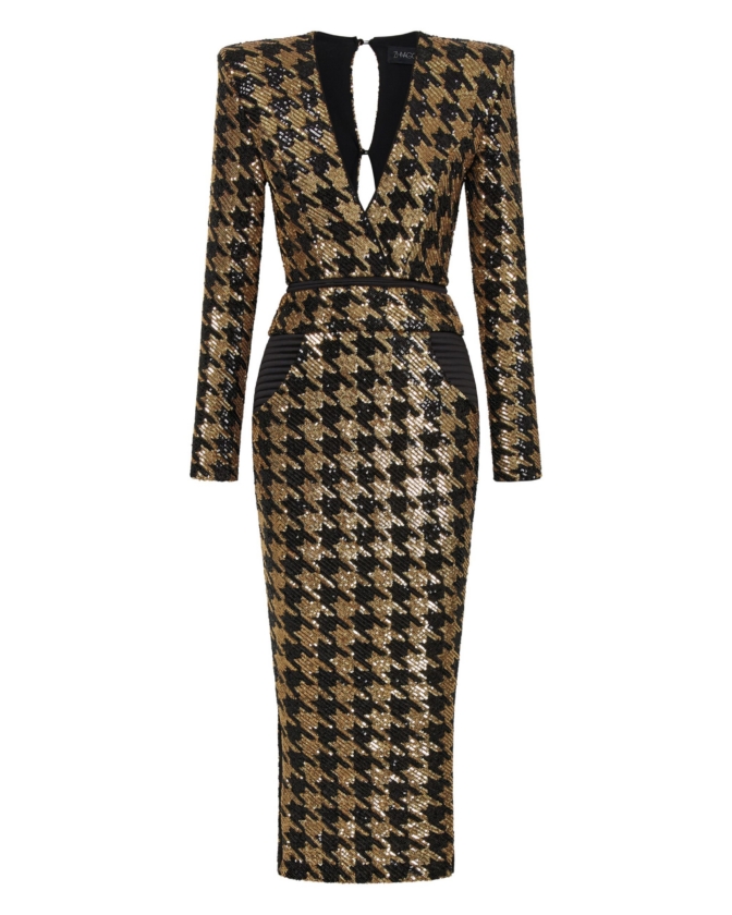 A FULLY LINED HOUNDSTOOTH SEQUIN MIDI DRESS THAT UNZIPS AT THE WAIST TO WEAR INDIVIDUALLY AS A TOP AND A SKIRT. ZHIVAGO FABRIC.