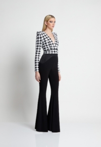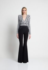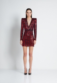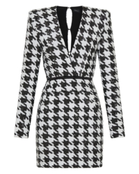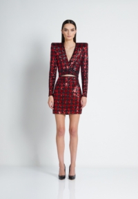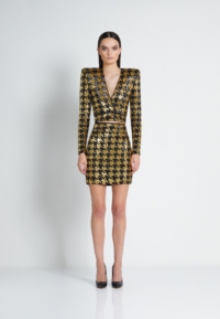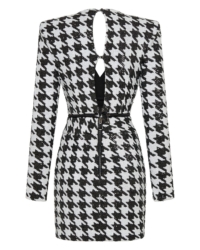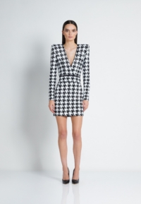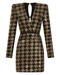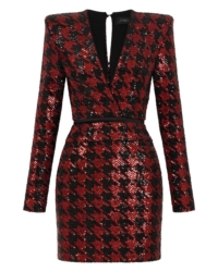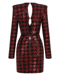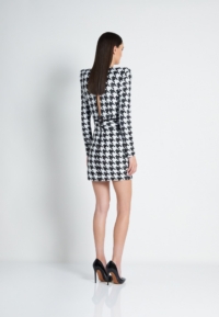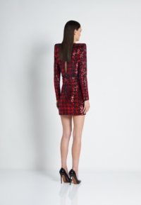 FULLY LINED HOUNDSTOOTH SEQUIN MINI DRESS THAT UNZIPS AT THE WAIST TO WEAR INDIVIDUALLY AS A TOP AND A SKIRT. ZHIVAGO FABRIC.