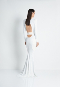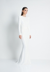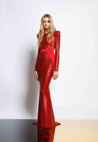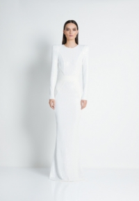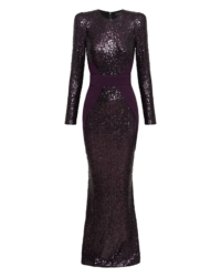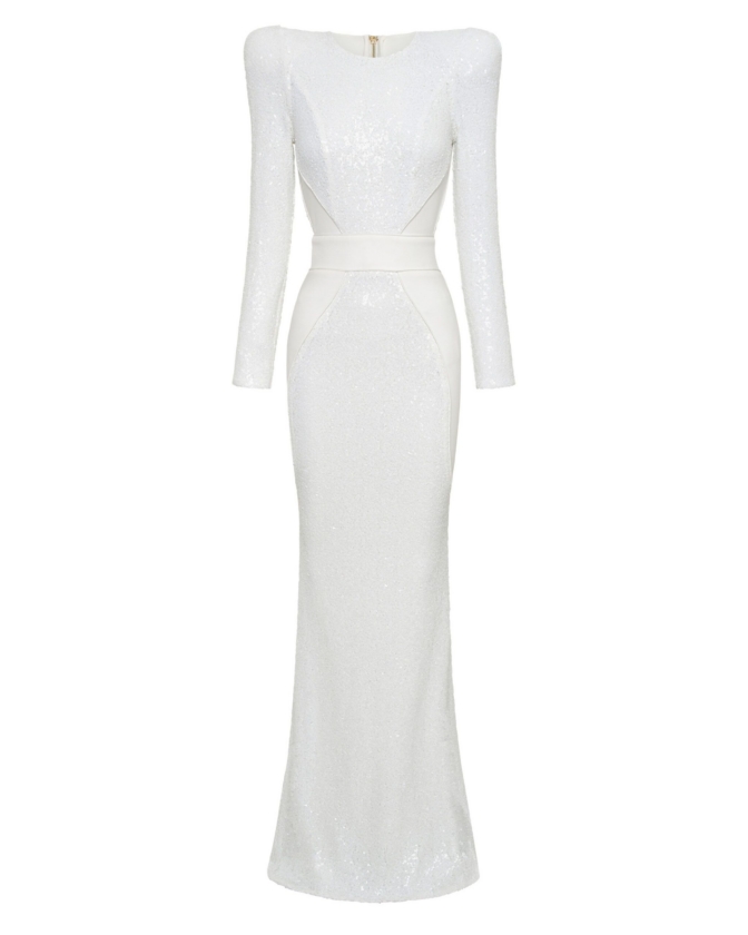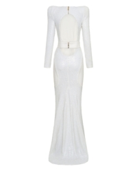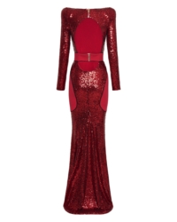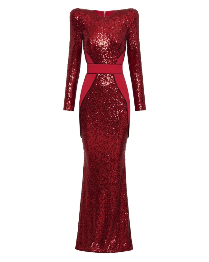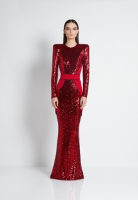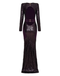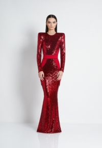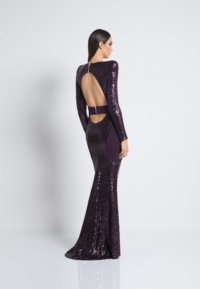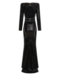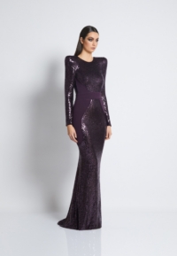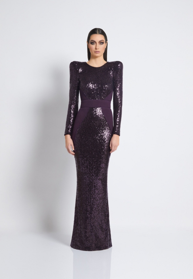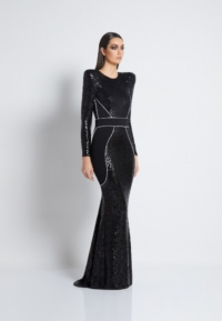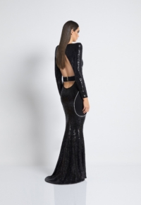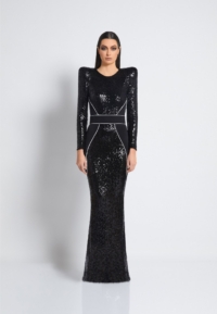 FULLY LINED STRETCH SEQUIN GOWN WITH SATIN PANELLING, OPEN BACK DETAIL & CURVED SHOULDER ACCENTS.