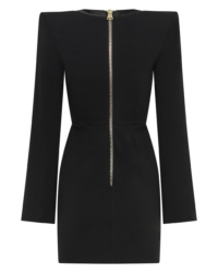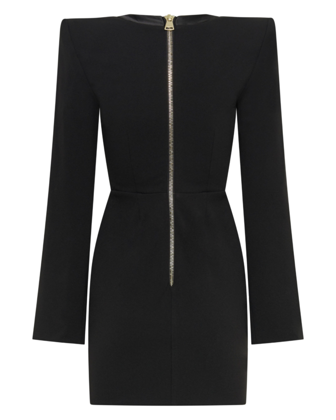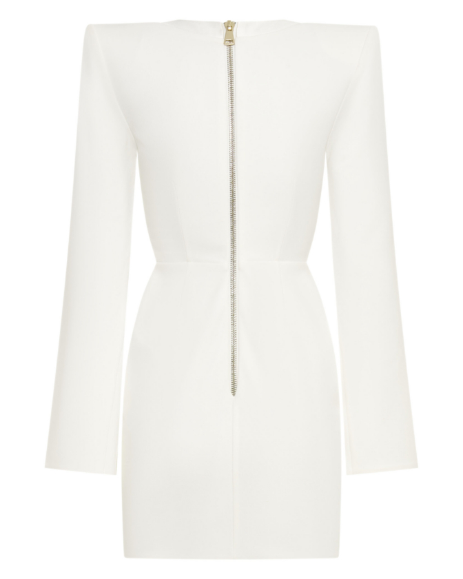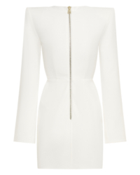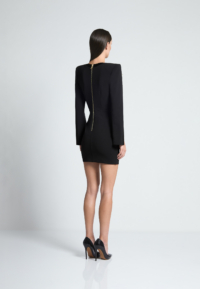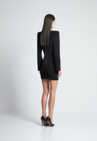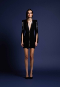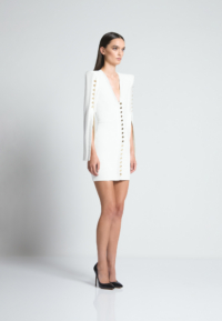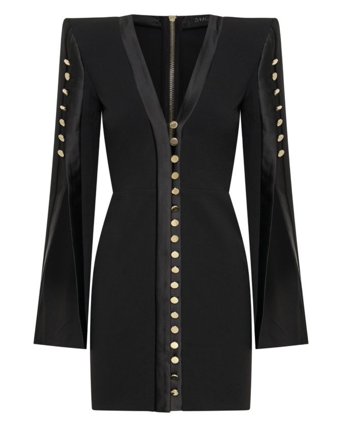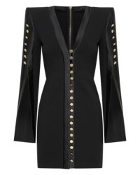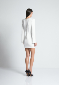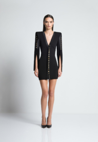 A MINI DRESS WITH SHOULDER ACCENTS, BUTTON, AND LOOP FRONT FASTENINGS with A V NECKLINE. OPEN SPLIT SLEEVES WITH BUTTON DETAILS