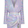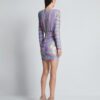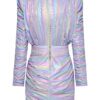A METALLIC FABRIC MINI DRESS WITH LONG SLEEVES AND A SIGNATURE STITCHED WAISTBAND, JEWELLED SUSPENDER DETAIL & SHOULDER ACCENTS