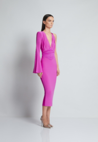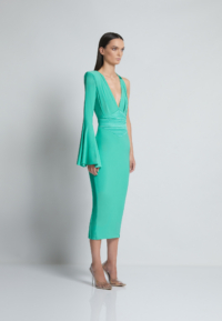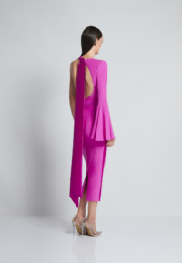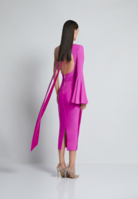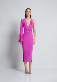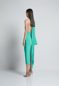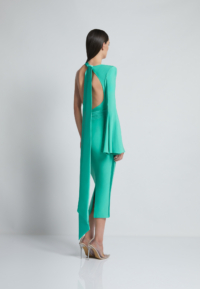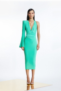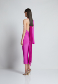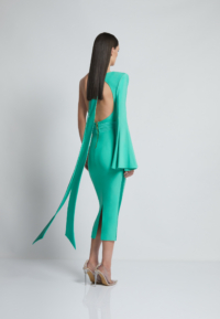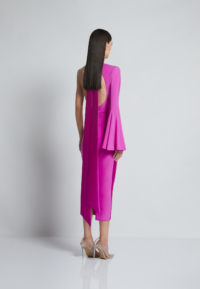 FULLY LINED ASYMMETRIC JERSEY DRESS WITH HALTER NECK/SINGLE FLARED SLEEVE, V-SHAPED SATIN CINCHER WAIST & SHOULDER ACCENTS