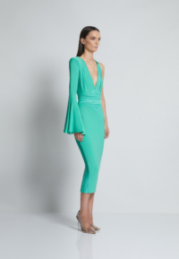 THE STRETCH JERSEY FABRIC IS VERY ACCOMMODATING TO ALL BODY TYPES, GIVEN THE FLEXIBLE NATURE OF THE FABRIC.