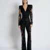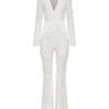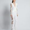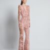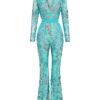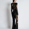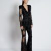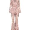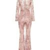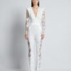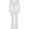 A PARTIALLY LINED FLORAL LACE JUMPSUIT WITH STITCHED SATIN WAISTBAND AND PANELLING & SHOULDER ACCENTS