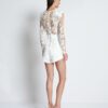 A PARTIALLY LINED FLORAL LACE PLAYSUIT WITH SIGNATURE V SHAPE SATIN CINCHER WAIST AND SHOULDER ACCENTS