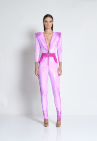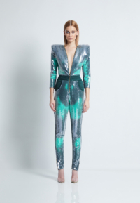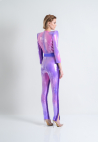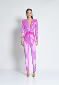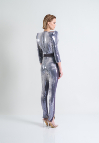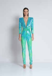 A PATENT PENDING CHAMELEON “MOOD” SEQUIN FULLY LINED JUMPSUIT WITH FRONT ZIP, SHOULDER ACCENTS, POCKETS AND SIGNATURE STITCHED SATIN PANELLING