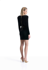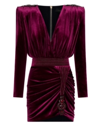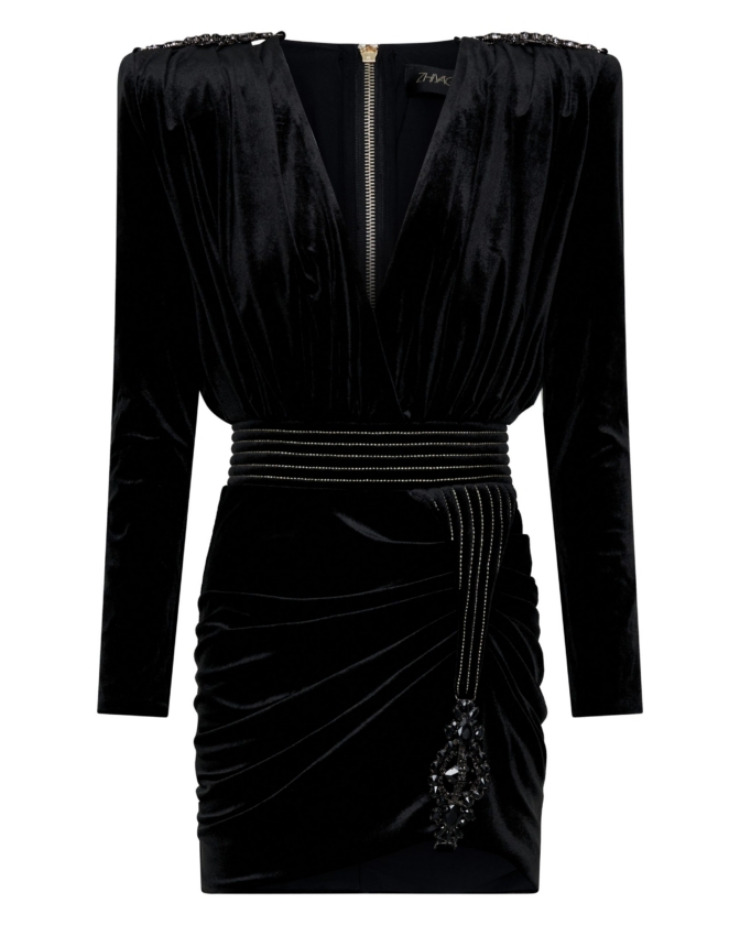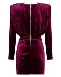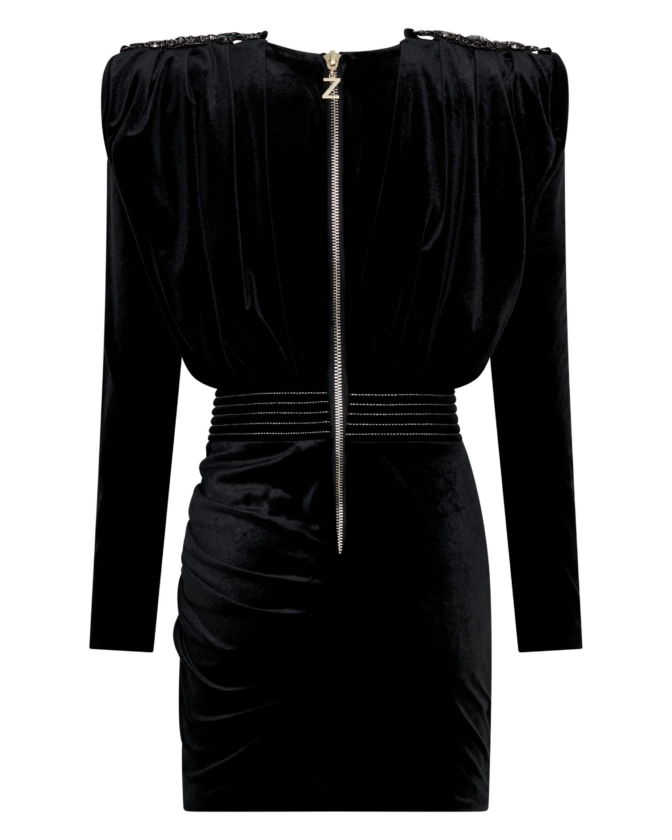 A FULLY LINED VELVET MINI DRESS WITH SIGNATURE STITCHED WAISTBAND JEWELLED SUSPENDER DETAIL AND SHOULDER ACCENTS
