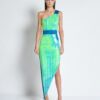 A CHAMELEON “MOOD” SEQUIN ASYMETRIC HEM GOWN WITH STITCHED SATIN STRAP, WAISTBAND AND PANELLING