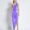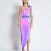 A PATENT PENDING CHAMELEON “MOOD” SEQUIN ASYMETRIC HEM GOWN WITH STITCHED SATIN STRAP, WAISTBAND AND PANELLING
