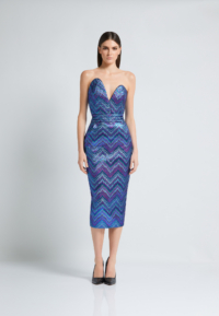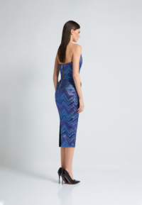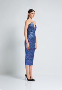 A SLEEVELESS METALLIC TAFFETA MID-LENGTH DRESS WITH STITCHED ASYMETRICAL BODICE FEATURE AND STITCHED WAIST