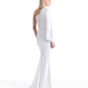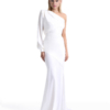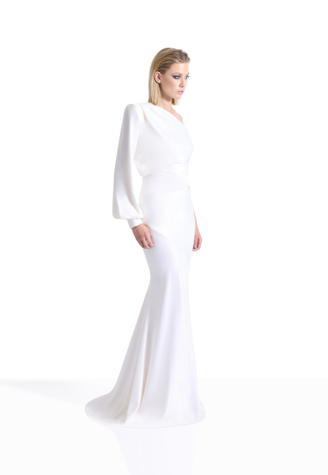 The Don’t Look Now Gown is defined by sculptural contrast and controlled fluidity. A one-shoulder neckline creates striking asymmetry, balanced by a single elongated sleeve finished with a refined cuff. The silhouette is anchored by a structured waistband before falling into a fluid stretch satin skirt that elongates the frame with quiet precision.