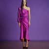 A FULLY LINED BIAS CUT DRESS WITH SINGLE BILLOW CUT SLEEVE, STITCHED WAIST AND CUFF & SHOULDER ACCENT