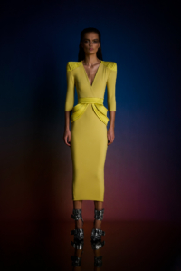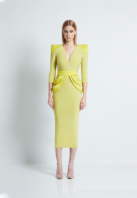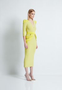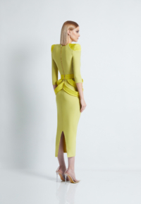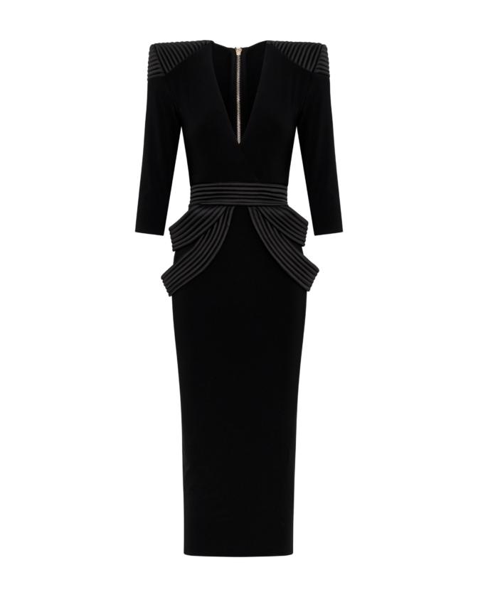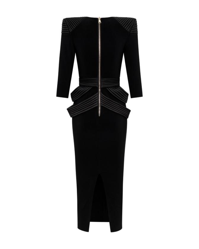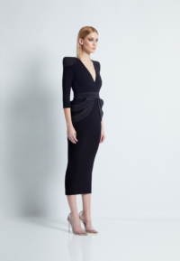 A JERSEY MIDI DRESS WITH STITCHED SATIN HIP DETAILING & SHOULDER CAPS