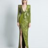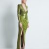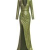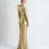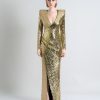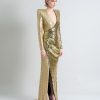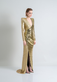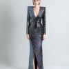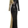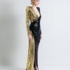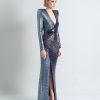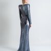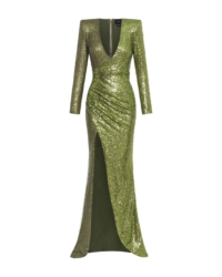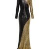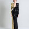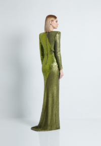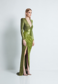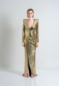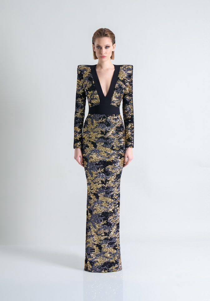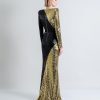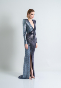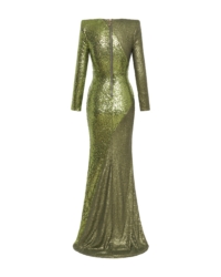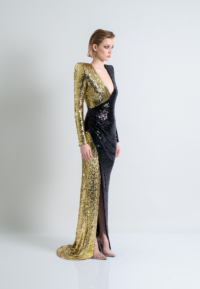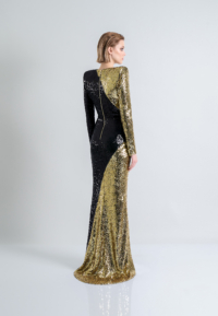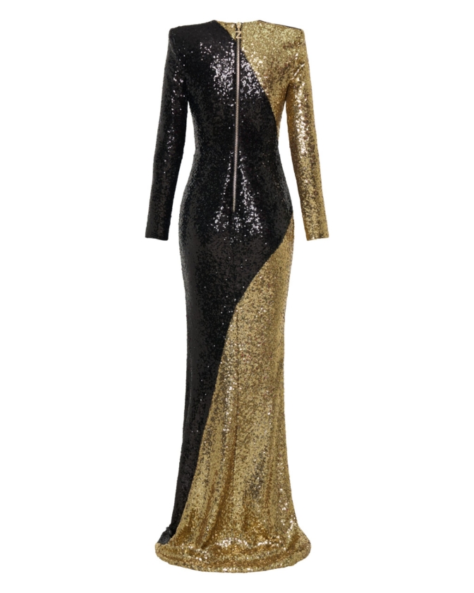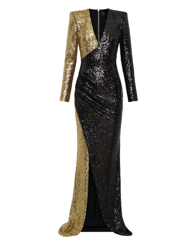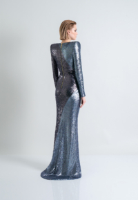 A STRETCH SEQUIN TWO TONE GOWN WITH WRAP STYLE FOR EASY FIT & SHOULDER ACCENTS