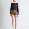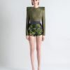 A SHEER STRETCH MESH TOP WITH STITCHED SATIN SHOULDER ACCENTS