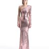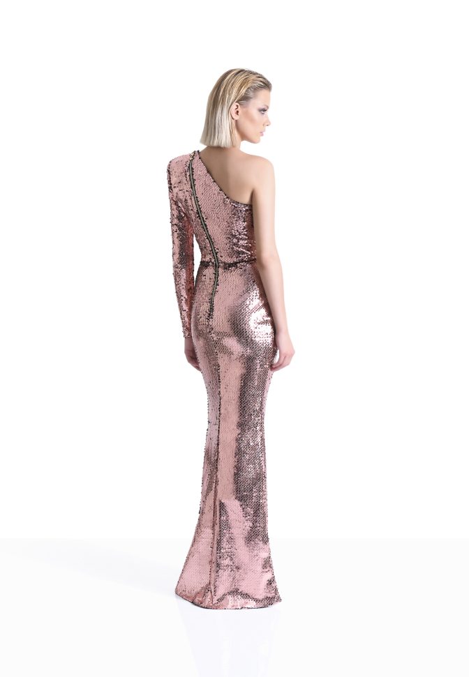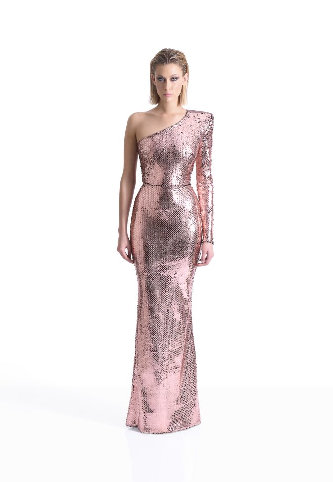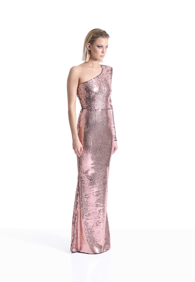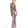 A PAINTED SEQUIN VELVET ONE SHOULDER EASY FIT GOWN