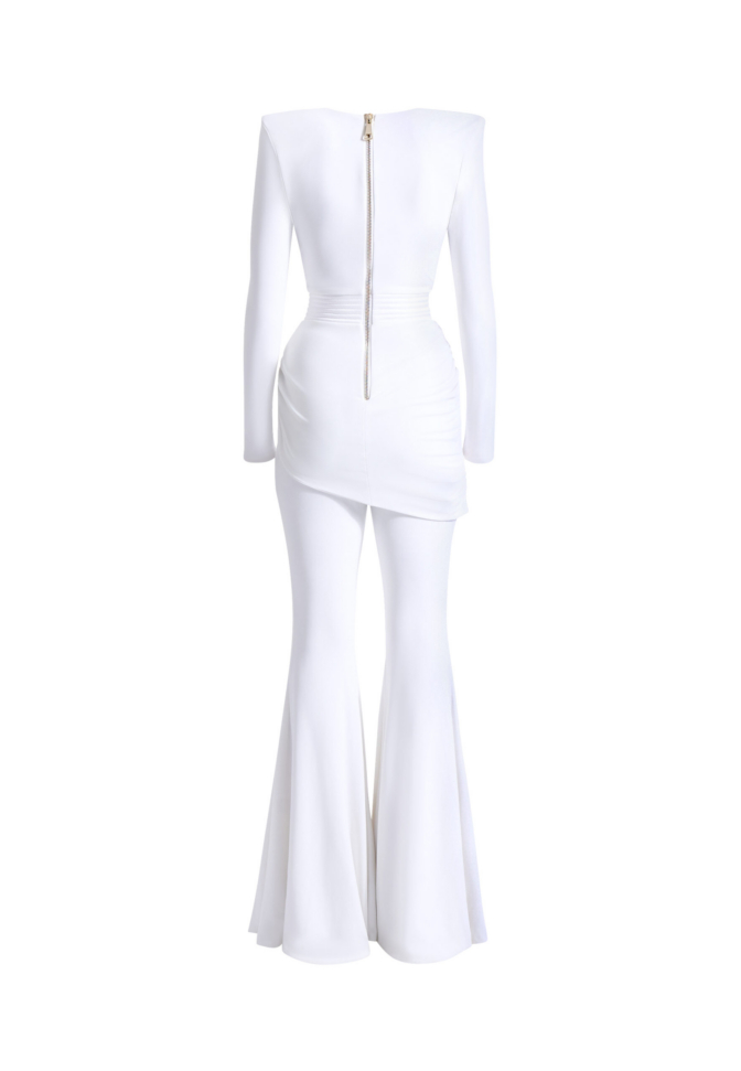 A JERSEY COWL NECK JUMPSUIT WITH FLARED PANTS AND SKORT OVERLAY
