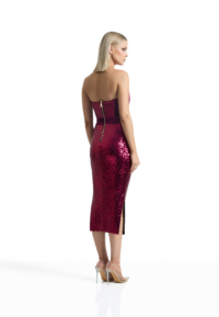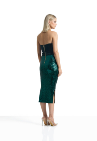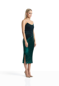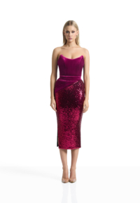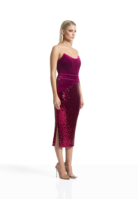A STRAPLESS EASYFIT SEQUIN DRESS WITH STITCHED VELVET PEAKED BODICE AND HIP PANELLING