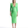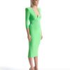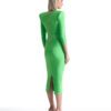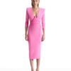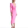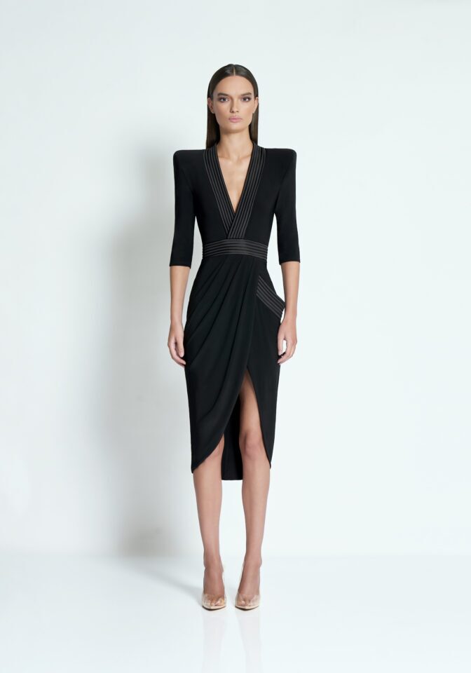 A JERSEY DRESS WITH V NECK, STITCHED SATIN INNER BUST FEATURE, SKIRT SUSPENDER DETAIL AND SHOULDER ACCENTS