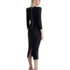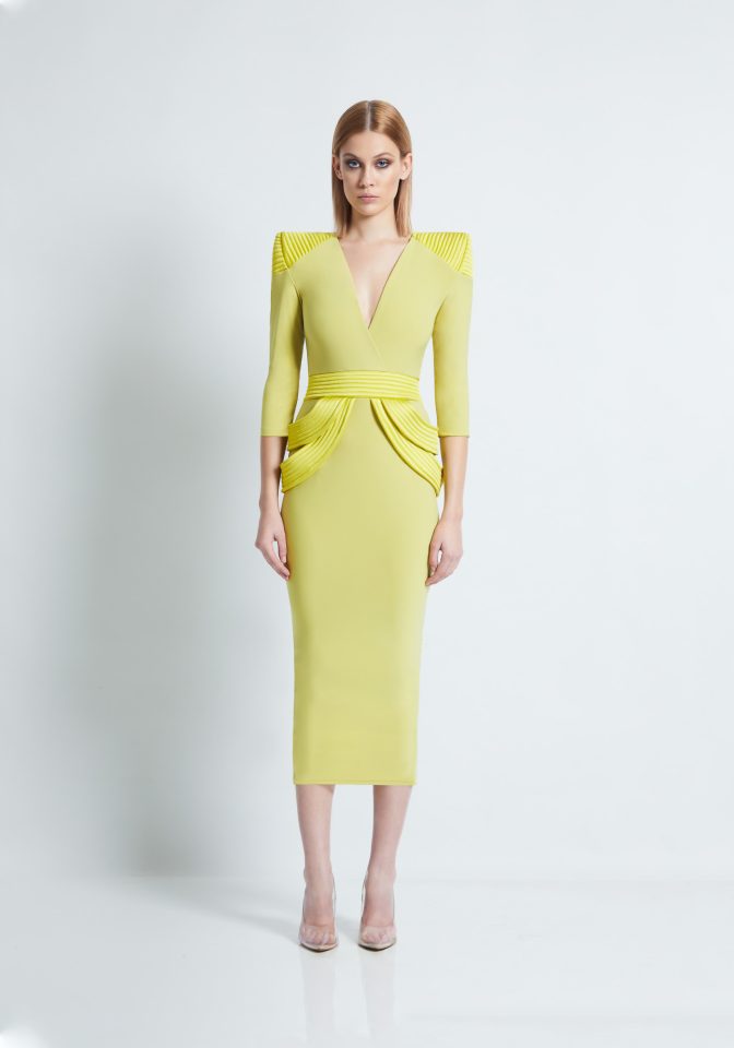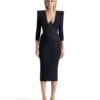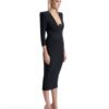 A JERSEY DRESS WITH V NECK, STITCHED SATIN INNER BUST FEATURE, SKIRT SUSPENDER DETAIL AND SHOULDER ACCENTS.