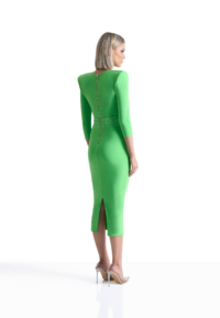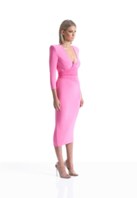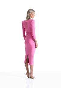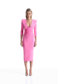 A JERSEY DRESS WITH V NECK, STITCHED SATIN INNER BUST FEATURE, SKIRT SUSPENDER DETAIL AND SHOULDER ACCENTS