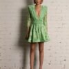 A PARTIALLY LINED BEADED LACE MINI DRESS WITH A-LINE RUFFLE SKIRT, SATIN OVERLAY WAIST CINCHER, AND SHOULDER ACCENTS.