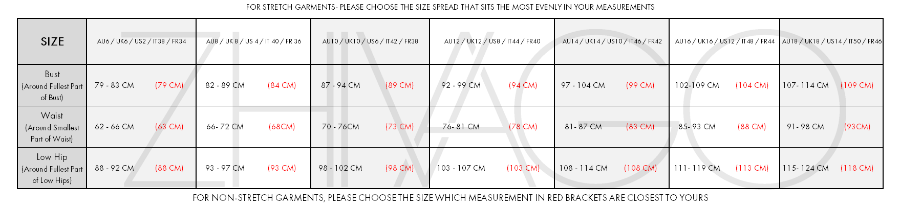Waists tend to follow the below scale- however for bust & hip, stretch garments can accommodate much more than the below scale: