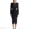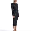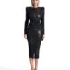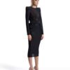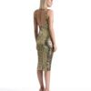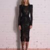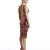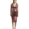 A SHEER STRETCH MESH MIDI DRESS WITH STITCH SATIN HIP DETAILING AND SHOULDER CAPS. COMES WITH STRETCH SEQUIN SLIP