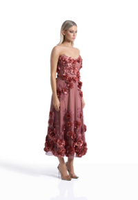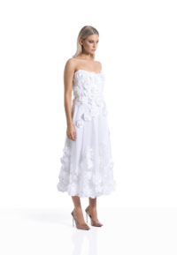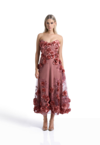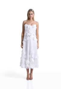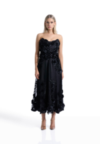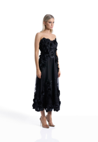 The Aonia Dress is a strapless midi silhouette defined by refined floral lace and controlled proportion. The intricate lace introduces depth and dimension while maintaining a clean, sculpted line. The result is a dress that feels composed, deliberate, and quietly commanding.