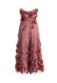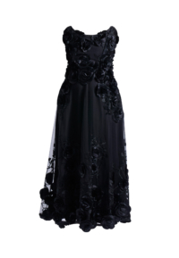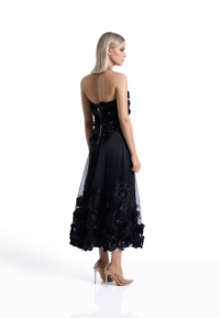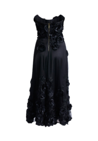 Built with internal structure, the bodice is padded and boned to hold the upper body securely, creating a precise strapless line through the waist. The silhouette remains sharp and stable while allowing graceful movement through the length of the dress.