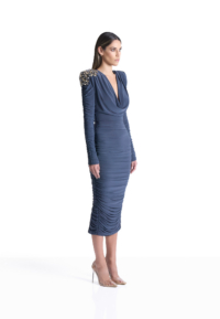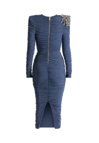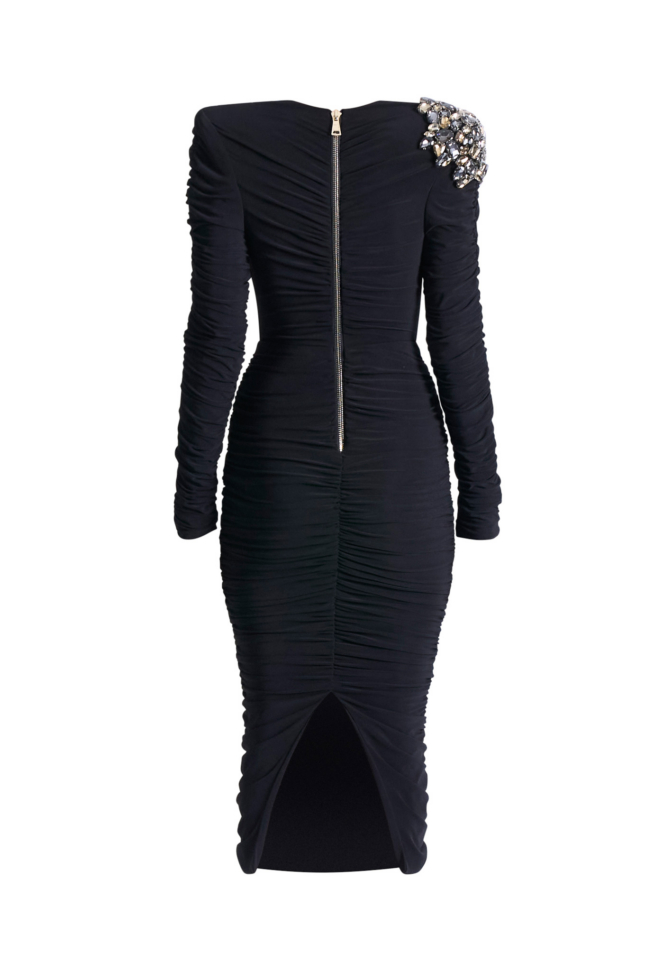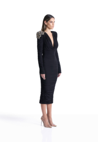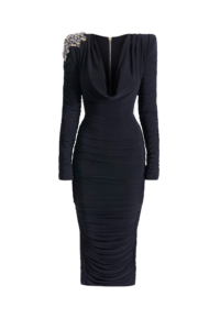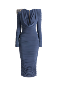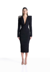 The Lustris Dress is a sculptural study in drape and proportion. A gathered stretch jersey base forms a fluid, refined silhouette while a softly draped neckline introduces effortless elegance. Scattered glass stones on the shoulder catch light with quiet authority, adding dimension without excess. Subtle shoulder accents refine the upper frame, creating balance and enhancing presence through every angle.