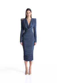 Cut in stretch jersey, the Lustris Dress is designed to follow the body’s natural line while maintaining refinement. The gathered construction contours through the bust and waist with ease, allowing the fabric to move with intention rather than cling. The draped neckline softens the upper silhouette, while the shoulder accents subtly define proportion and balance.