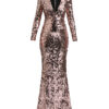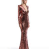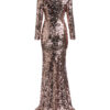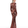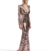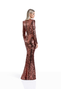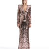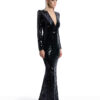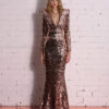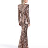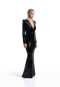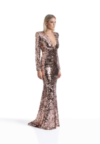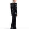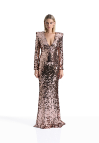 A FULLY LINED STRETCH SEQUIN GOWN WITH SHOULDER ACCENTS